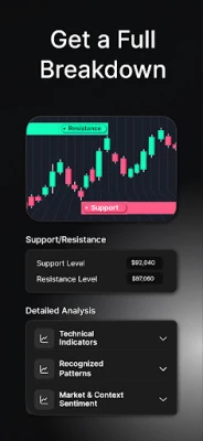 Всеки път, когато сканирате графика, Chart AI я разгражда на детайлни секции, за да оптимизира вашата стратегия. Получавате мигновена снимка на пазара с AI прецизност, включително яснота за посоката на тренда, конкретни сигнали за покупка или продажба, оценка на нивото на риск и анализ на обема за потвърждение на силата зад движението. Chart AI автоматично идентифицира и изчертава ключови зони на подкрепа и съпротива, визуално показвайки потенциални точки на обръщане. Освен това, приложението изгражда професионален стратегически план, предлагайки точни точки за вход, оптимизирани нива за фиксиране на печалба и предварително дефинирани точки за спиране на загубата, винаги с изчислен съотношение риск/печалба. За тези, които се нуждаят от още по-задълбочени данни, Chart AI предоставя подробен технически анализ на индикатори като RSI и MACD, обхващайки пазарния контекст и автоматично разпознавайки графични модели като клинове, триъгълници и флагове, дори в множество времеви рамки.