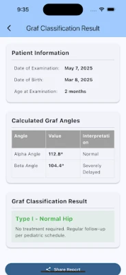 След като ъглите са измерени, HipAngle Pro автоматично класифицира тазобедрената става според критериите на Graf – от Тип I до Тип IV. Това незабавно ви показва дали ставата е нормална, незряла или диспластична, придружено от препоръки за следващи стъпки. Тази автоматизация ускорява процеса на вземане на решения, особено в натоварени клиники. Приложението е проектирано с интуитивен интерфейс за медицински специалисти, където контролите са изключително прости: докоснете, за да поставите или плъзнете точки, използвайки функцията за увеличение/панорама за детайлен фокус. Цветно кодирани линии, подобни на стандартните диаграми на Graf, гарантират изключителна яснота на дисплея.