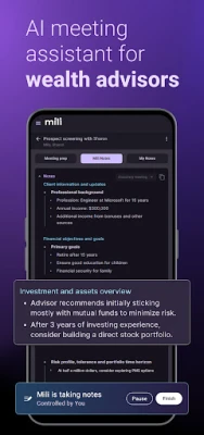 Mili е най-добрият асистент за срещи и проследяване, предназначен за финансови консултанти. Спрете да губите време с множество екрани и безкрайни последващи дейности. С Mili ще освободите време и ще се съсредоточите върху най-важното – вашите клиенти.