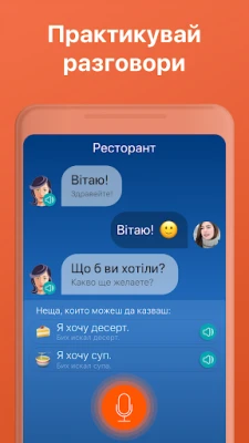 Забравете за скучните учебници и традиционните методи, които водят до минимални резултати. Mondly предлага свеж подход, основан на реални диалози, които ви потапят директно в езиковата среда. Започвайки с практични разговори, ще усвоявате украински фрази интуитивно, изграждайки солидна основа за комуникация. Със своята усъвършенвана технология за разпознаване на речта и алгоритми за интервално повторение, приложението действа като ваш личен езиков инструктор, който ви напътства и коригира, превръщайки всеки урок в стъпка напред.