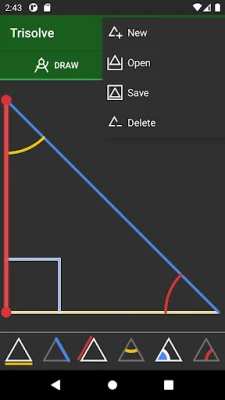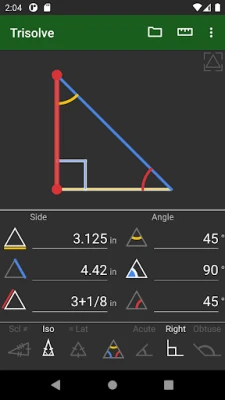 Насладете се на прецизност и удобство с функциите за чертане, които включват потребителски дефинируеми страни, ъгли и върхове, автоматично центриране и мащабиране на графиката, както и заключване на осите. Числовите възможности са несравними, предлагайки 15 единици за ъгли (градуси, радиани, проценти и други) и универсални мерни единици за дължина (метрични, SAE), с автоматично конвертиране. Интерфейсът е създаден за ваше удобство – бързо въвеждане на правоъгълен триъгълник, запазване на индивидуални стойности, динамични настройки на полетата и тъмен фон за намаляване на напрежението в очите, съвместим с портретен и пейзажен режим.