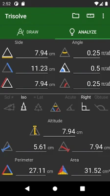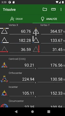 TriSolve: Калкулатор за триъгълници е уникално приложение, което чертае въведените от вас стойности и въвежда начертаните. Идеален за учители, студенти, инженери, строители и всеки, който решава триъгълници. Решава за страни, ъгли, периметър, лице, височини и центрове. Предлага частични, обратни изчисления и трансформации.